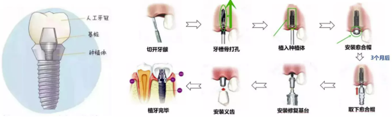 種植牙結(jié)構(gòu)和手術(shù)流程 來(lái)源:泰康拜博口腔醫(yī)院官網(wǎng)、搜狐網(wǎng)、國(guó)海證券研究所
