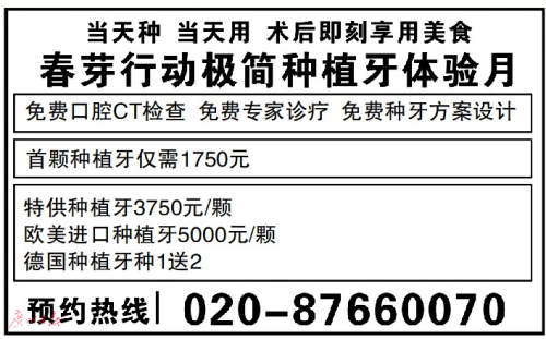 您是否長(zhǎng)期遭受多顆牙缺失的困擾?您是否有在年前種牙的想法,卻有很多顧慮和疑問,或因?yàn)檠啦酃?萎縮、牙周炎等問題難以實(shí)現(xiàn)?春芽行動(dòng)、春芽口腔種植研究所聯(lián)合德國口腔頜面外科協(xié)會(huì),年前將集中為前牙缺失、后牙缺失、多顆牙缺失、半口無牙甚至全口無牙患者一對(duì)一制定德國領(lǐng)先的數(shù)字化種牙方案。市民預(yù)約種牙免口腔CT檢查費(fèi)、專家會(huì)診費(fèi)。極簡(jiǎn)種植牙“迎春至簡(jiǎn)價(jià)”體驗(yàn)月,首顆種植牙1750元(含基臺(tái)、牙冠),更多優(yōu)惠種牙資訊可撥打熱線020-87660070垂詢。
