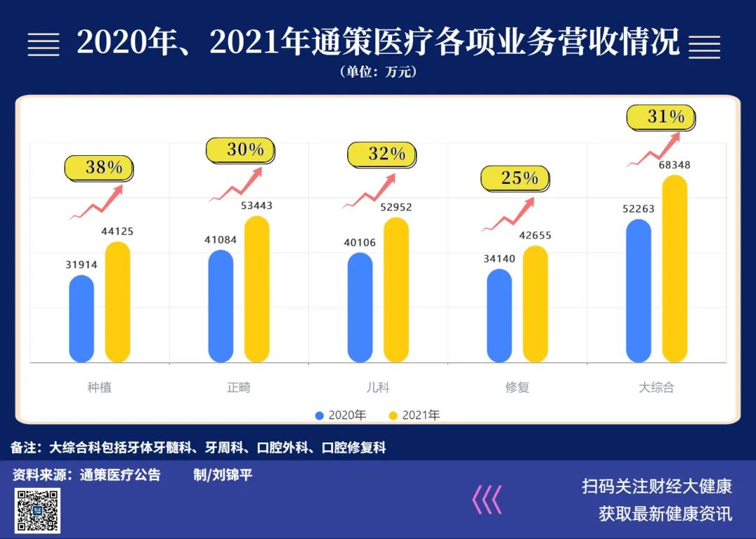 從2020年、2021年的財報數(shù)據(jù)來看,種植業(yè)務為通策醫(yī)療貢獻了可觀的收入,尤其是2021年收割4.41億元,同比增長38%,位列通策醫(yī)療五大業(yè)務板塊增速第一位。