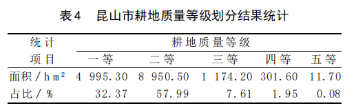 由表4可知,昆山市耕地質(zhì)量等級以二等和一等為主,其中耕地質(zhì)量為一等的面積達4 995.3 hm2,占總面積的 32.37%;耕地質(zhì)量為二等的面積達8 650.5 hm2,占總面積的 57.99%;耕地質(zhì)量為三等、四等、五等的面積分別為1 174.2、301.6、11.7hm2。同時,通過綜合分析,昆山市耕地質(zhì)量整體上表現(xiàn)為東南部區(qū)域好于西北部區(qū)域,一等耕地主要分布于東南部的千燈鎮(zhèn)、淀山湖鎮(zhèn)和錦溪鎮(zhèn),二、三等耕地各鎮(zhèn)均有分布,四等耕地主要位于玉山鎮(zhèn)(昆山高新區(qū))西部和花橋開發(fā)區(qū)東部,五等耕地主要位于花橋開發(fā)區(qū)東部。玉山鎮(zhèn)(昆山高新區(qū))西部和花橋開發(fā)區(qū)東部的耕地質(zhì)量等級較低,分析其原因主要與土地平整、養(yǎng)殖魚塘復(fù)墾及土壤重金屬污染有關(guān)。