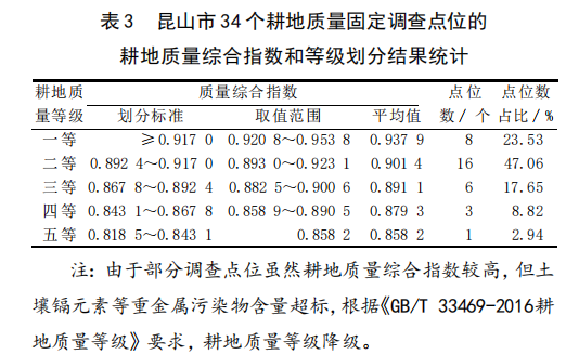 耕地質(zhì)量等級總體情況采用《GB/T 33469-2016 耕地質(zhì)量等級》和《全國耕地質(zhì)量等級評價指標(biāo)體系》推薦的方法對昆山市34個耕地質(zhì)量固定調(diào)查點位進行了質(zhì)量綜合指數(shù)計算與等級劃分,具體結(jié)果見表 3。由表 3可知,昆山市34個耕地質(zhì)量固定調(diào)查點位的耕地質(zhì)量綜合指數(shù)介于 0.858 2~0.953 8,平均值為 0.904 9。耕地清潔程度調(diào)查與評價是耕地質(zhì)量綜合評價的重要組成部分之一。同時,昆山市34個耕地質(zhì)量固定調(diào)查點位的耕地清潔程度評價結(jié)果表明,在34個固定調(diào)查點位中,有 3 個調(diào)查點位的土壤污染等級為尚清潔,3個調(diào)查點位的土壤污染等級為輕度污染,這 6 個點位的污染物類型皆為鎘。根據(jù)《GB/T33469-2016耕地質(zhì)量等級》要求,這些調(diào)查點位的耕地質(zhì)量等級降級。