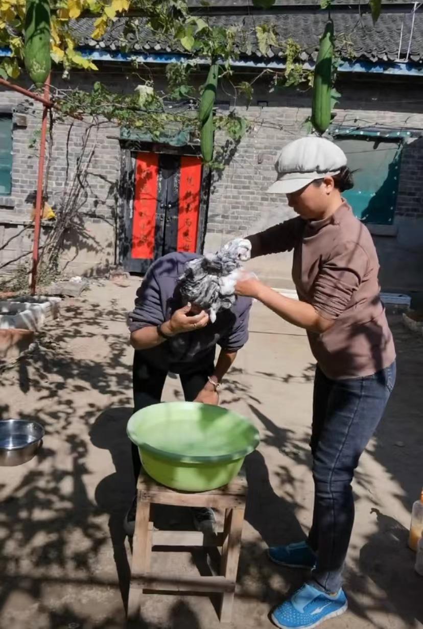 在老家院子里,俞長花人生第一次為母親洗頭。 網(wǎng)絡(luò)截圖