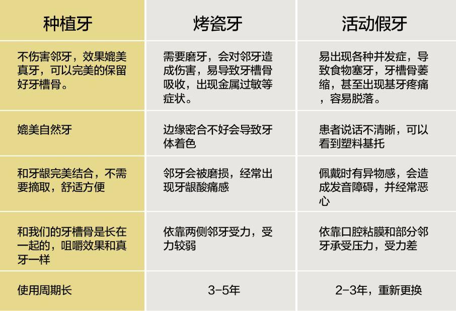 種植牙、烤瓷牙(固定假牙)、活動假牙