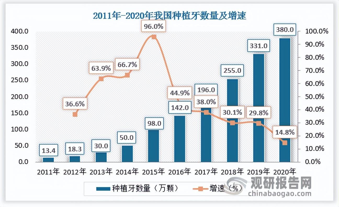 數(shù)據(jù)顯示,2011年-2020年我國種植牙數(shù)量由13.4萬顆達(dá)到380.0萬顆,2020年市場(chǎng)規(guī)模達(dá)240億元,占口腔市場(chǎng)的25%。