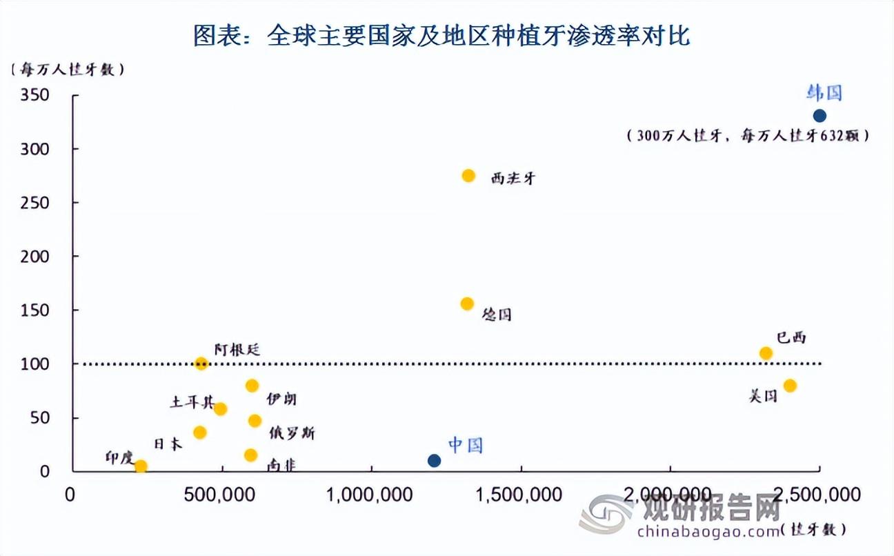 對(duì)標(biāo)海外,韓國的種植牙因?yàn)榧{入醫(yī)保滲透率上升迅猛,達(dá)到每萬人632顆,為高。滲透率達(dá)到每萬人100顆以上的包括西班牙、德國、巴西、阿根廷,美國為接近100萬。相比之下我國種植牙滲透率很低,核心要素是支付可及性低。對(duì)比各國種植牙價(jià)格/GDP比例,韓國種植牙價(jià)格/GDP比例低,不到5%,考慮到醫(yī)保覆蓋,韓國個(gè)人實(shí)際支付比例更低;其次意大利、美國、英國、西班牙,以及新興市場(chǎng)土耳其、巴西和墨西哥等也較低,相應(yīng)的這些的種植牙滲透率較高。而我國的種植牙收費(fèi)與GDP比例接近20%,處于較高水平。今年以來國內(nèi)多地醫(yī)保局發(fā)布通知調(diào)查種植牙費(fèi)用,種植牙集采或加速推進(jìn),種植牙數(shù)量有望呈現(xiàn)爆發(fā)式增長。