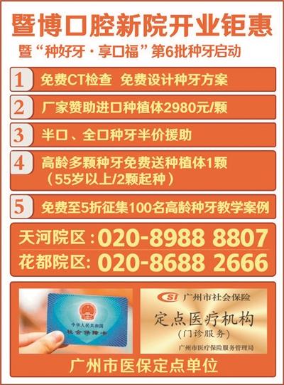 半口、全口無牙,是高齡長(zhǎng)者常見的缺牙問題。多顆種牙費(fèi)用高,手術(shù)時(shí)間較長(zhǎng),會(huì)導(dǎo)致不少高齡長(zhǎng)者想種牙又不敢種。近日,廣州市知名醫(yī)保定點(diǎn)單位——暨博口腔,值連鎖新院開業(yè)之際,天河、花都雙院同步啟動(dòng)“種好牙·享口?!钡?批種牙援助,現(xiàn)正火熱報(bào)名中,廠家進(jìn)口種植體僅2980元/顆,半口、全口種牙半價(jià)補(bǔ)貼,55歲以上長(zhǎng)者種牙2顆以上,還可直接減免1顆進(jìn)口種植體,報(bào)名電話020-89888807。
