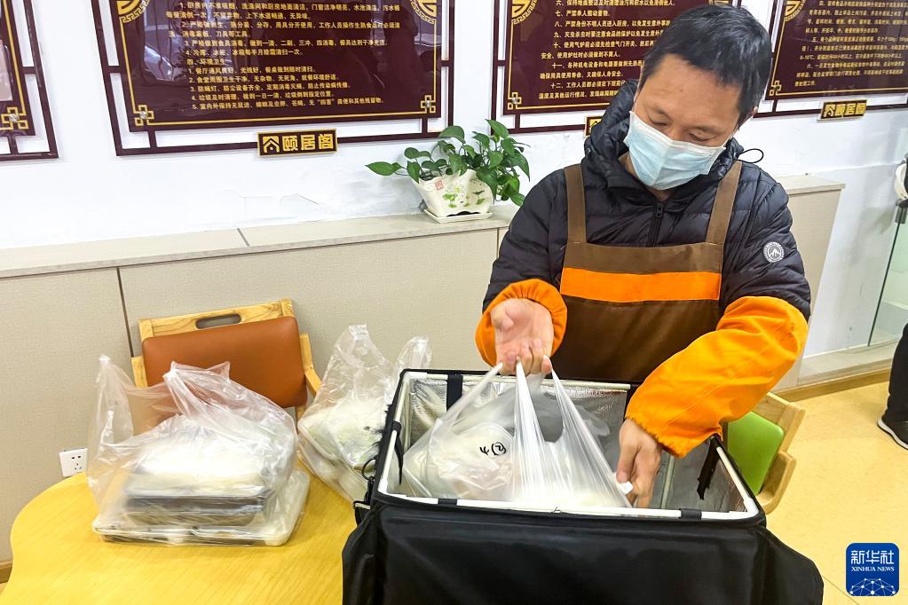 2022年11月3日,吉林省長(zhǎng)春市朝陽(yáng)區(qū)東田社區(qū)助老餐廳的工作人員準(zhǔn)備為社區(qū)居民送餐。新華社記者 趙丹丹 攝
