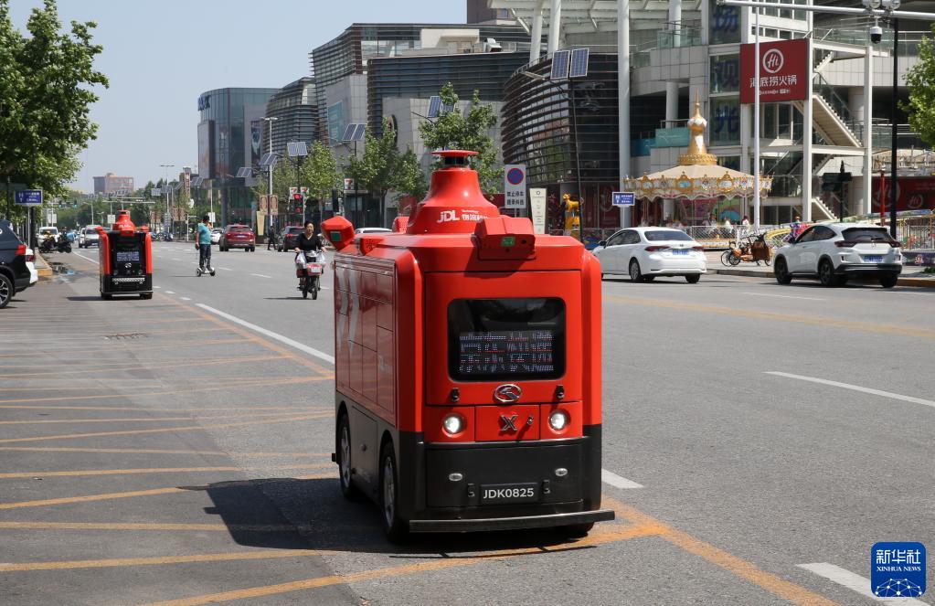 2021年5月18日,一輛自動(dòng)行駛快遞車在天津(西青)車聯(lián)網(wǎng)先導(dǎo)區(qū)內(nèi)運(yùn)送貨物。新華社發(fā)