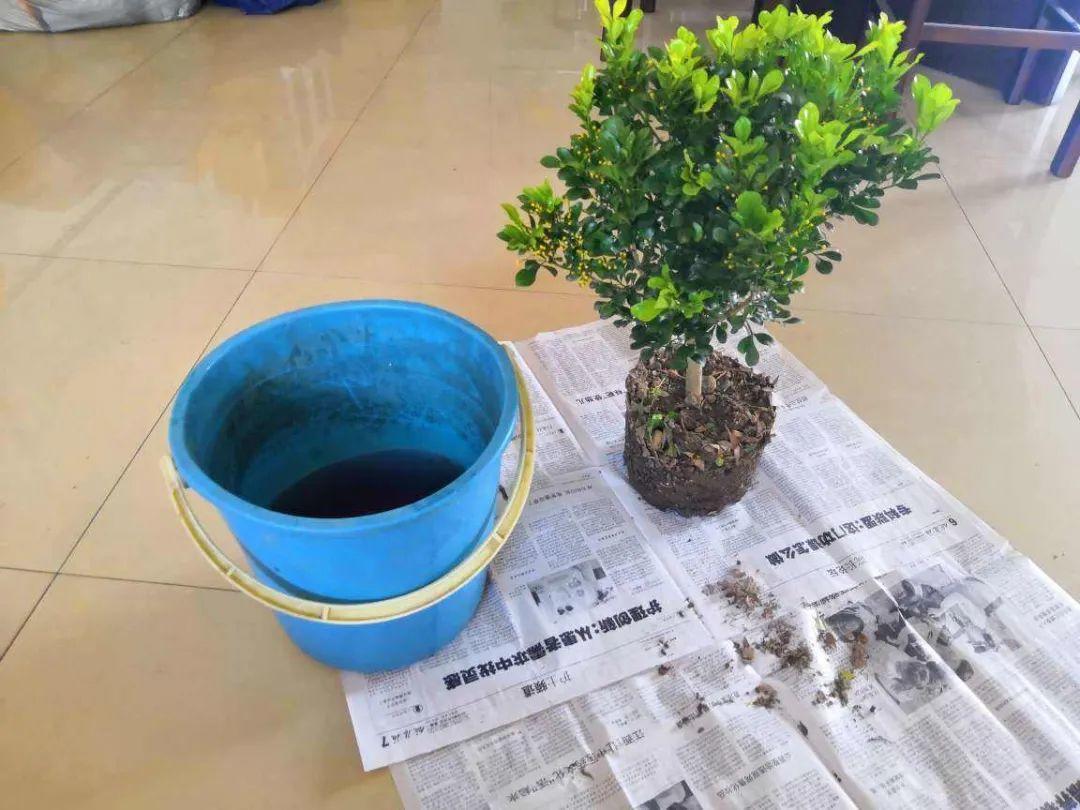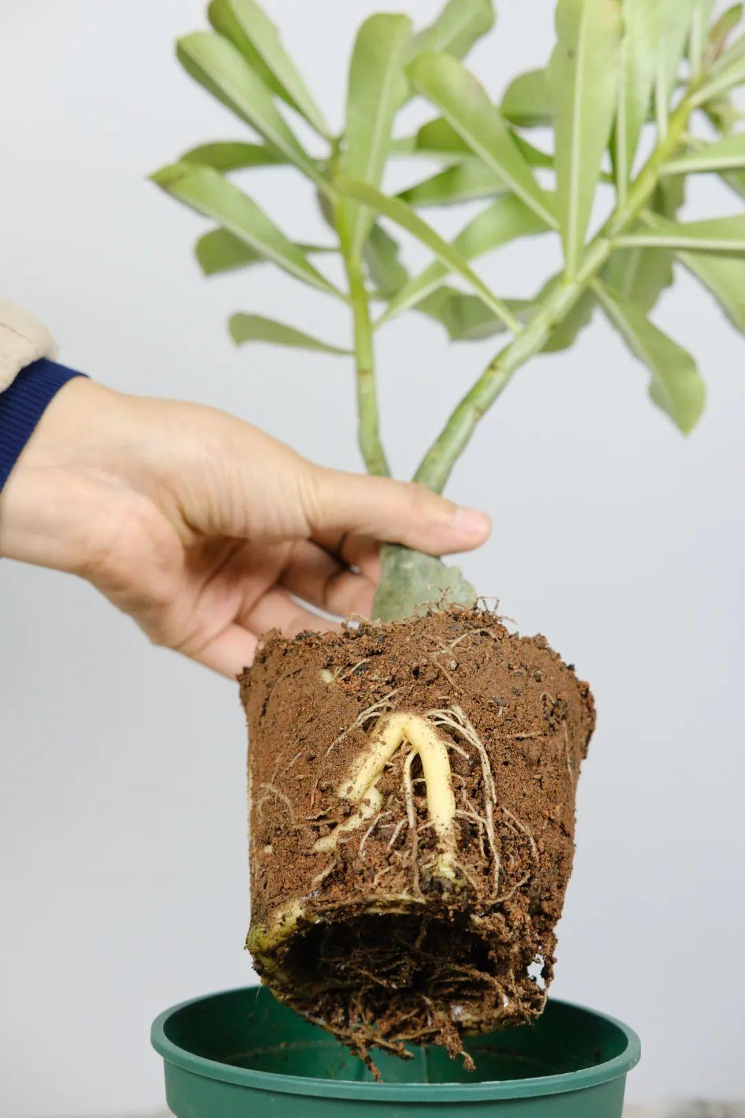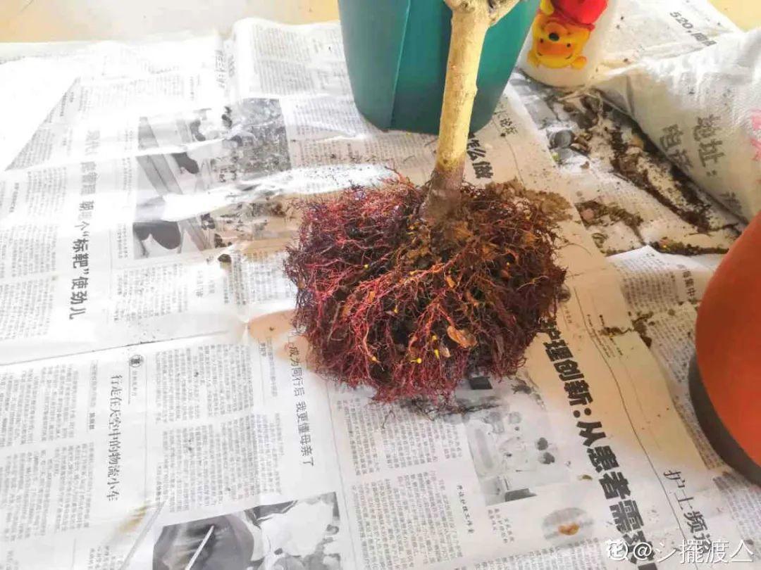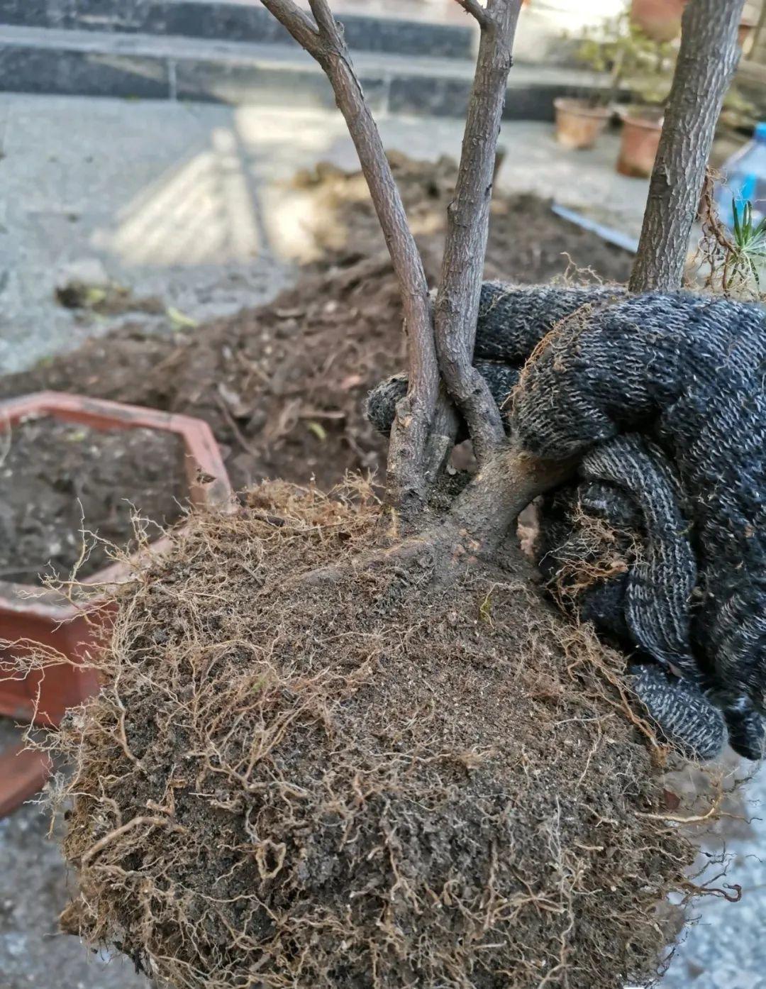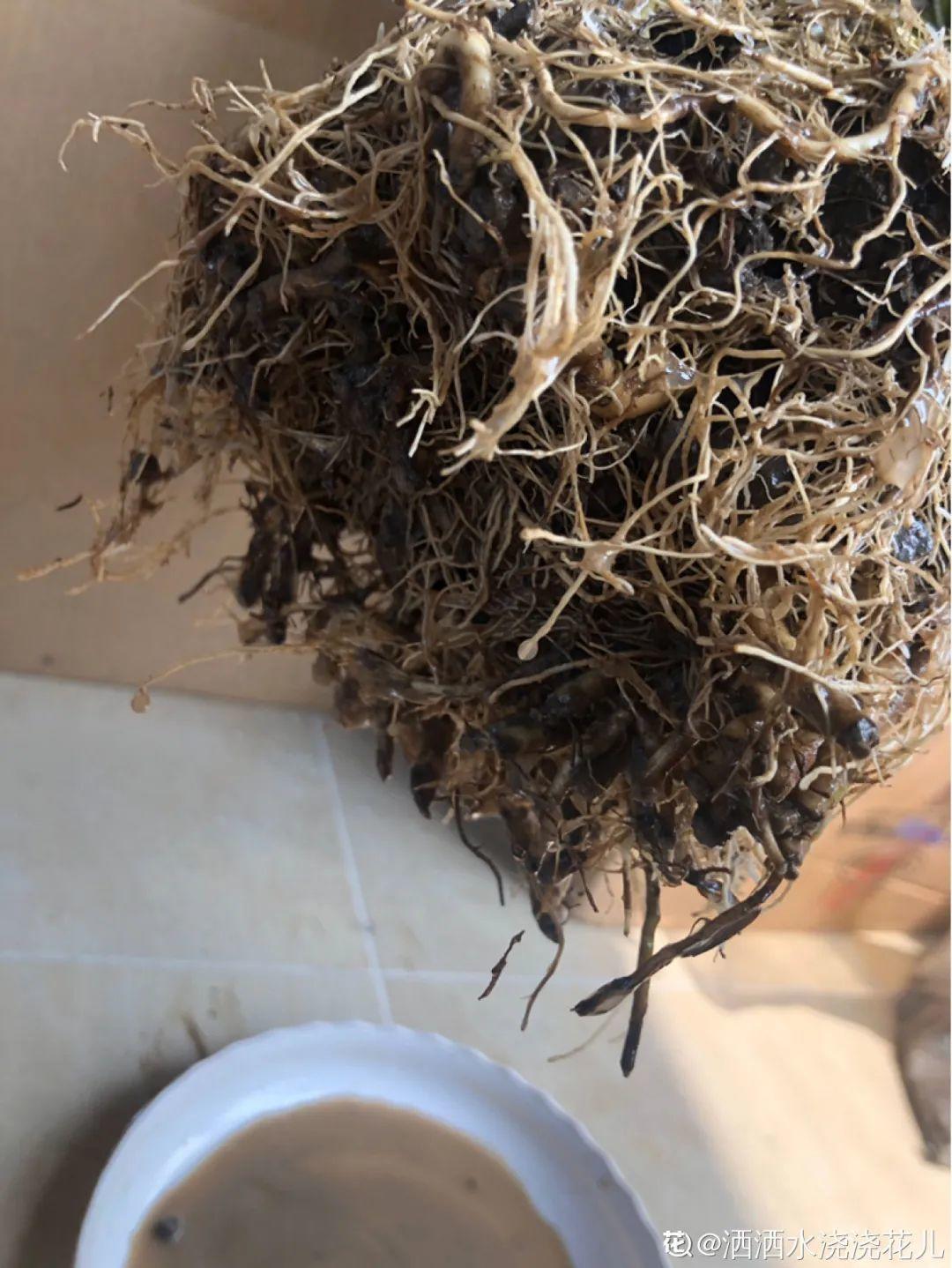 大家可以把它原來土坨外圍的1/3,用清水加點生根劑泡掉,露出外緣的毛細根系好扎根、吸收水分,中間剩下的2/3土坨留著作為護心土。