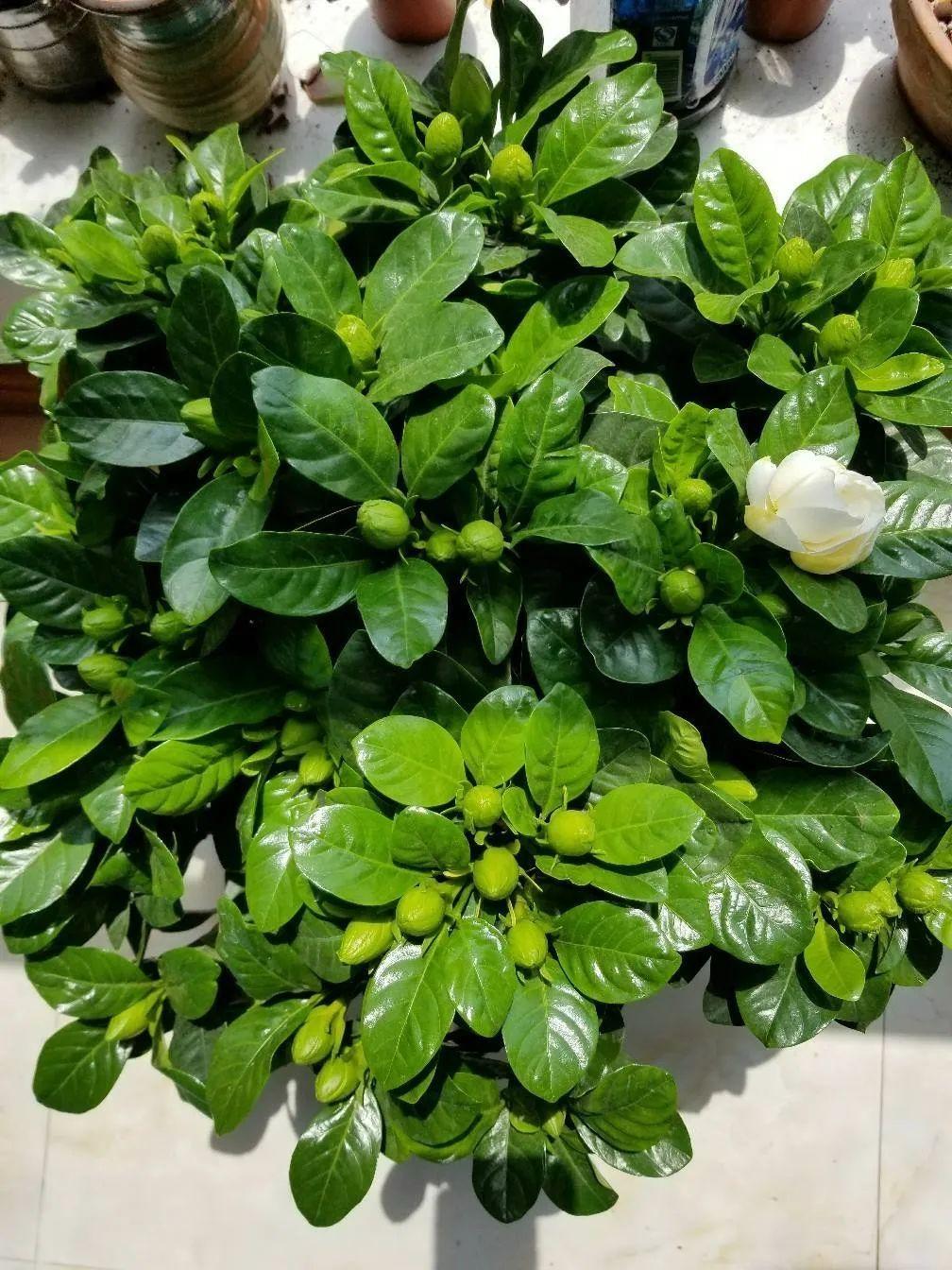 注意,剛買回來的帶苞梔子花,建議大家不要換盆、換土,就原封不動放家里散光通風的地方養(yǎng)著,等它開花,所有花都開完了,我們再考慮換盆。否則,買回家就換盆換土洗根,一個周內(nèi)花苞掉光,再過2-3個周,整個死翹,所以別折騰,越折騰越開不了花!
