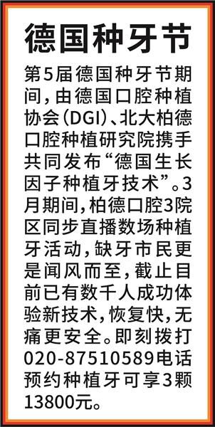 3月,柏德口腔直播德國種植牙技術(shù),不少缺牙市民紛紛來前來咨詢和體驗(yàn)。4月13日,柏德口腔再次舉辦德國種植牙技術(shù)直播,這是第5屆德國種牙節(jié)后兩場直播,缺牙市民可撥打電話報(bào)名參與。4月中旬,柏德口腔將舉辦大型活動(dòng),邀請《外來媳婦本地郎》中大佬“阿光”的主演蘇志丹和“蘇貴元”飾演者陳堅(jiān)雄現(xiàn)場分享他們種植牙的過程。想親臨現(xiàn)場的羊城街坊可以撥打電話報(bào)名。