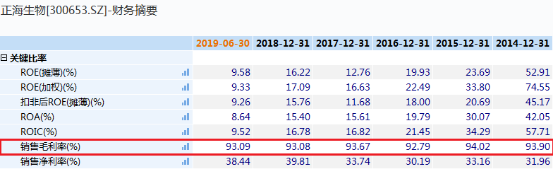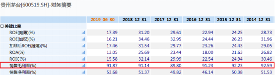 今年的毛利率還達(dá)到了93.09%,而貴州茅臺(tái)今年的銷售毛利率為91.87%。這并非是偶然成績(jī),基本上從2014年起,往后每年的銷售毛利率都超過(guò)了茅臺(tái)。
