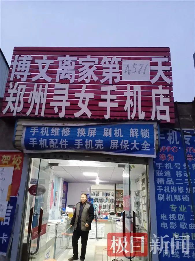 12月8日上午8點(diǎn)多,河南鄭州中原區(qū)須水鎮(zhèn)的“鄭州尋女手機(jī)店”營(yíng)業(yè)前,48歲的老板盧麗搭梯爬到3米多高的招牌上方,在“博文離家第XX天”的空白處,貼上“4573”。
