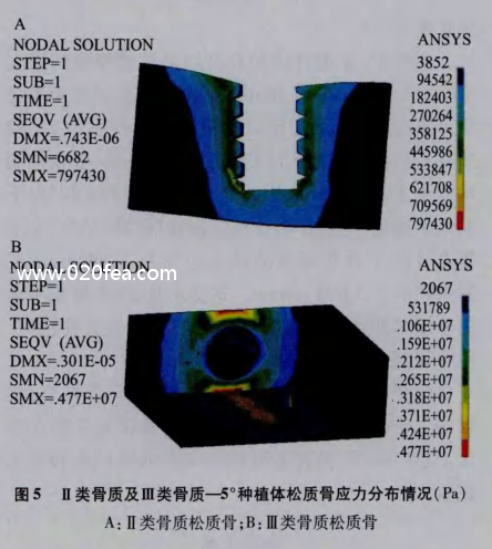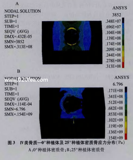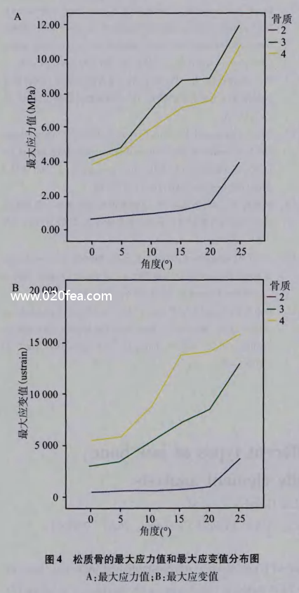 應力和應變是三維有限元分析力學常用的直觀的變量。本實驗使用ANSYS12.0大型有限元分析軟件對各個模型進行計算,分析在載荷條件下,密質骨和松質骨的大等應力及大應變量,以確定傾斜種植在不同質量頜骨中能否應用,以及可應用的大角度。