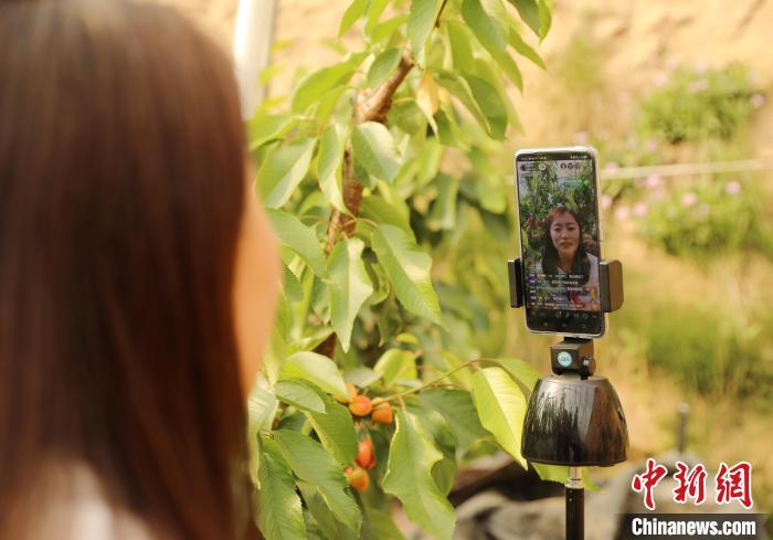 圖為在河北省固安縣儂人農(nóng)業(yè)園溫室大棚內(nèi),社員通過手機(jī)直播銷售櫻桃。 門叢碩 攝