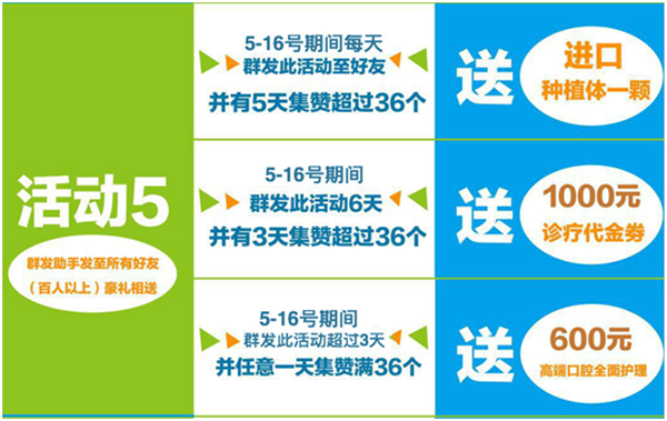 是的,您沒看錯,即日起利用群發(fā)助手將活動圖片發(fā)至百人以上好友,憑截圖至店均有豪禮相送。即日起-16日期間每天群發(fā)活動圖片至好友,每天集贊超過36個,送進(jìn)口種植體一顆;即日起-16日期間每天群發(fā)此活動,并有3天集贊超過36個,送1000元診療代金券;即日起-16日期間,群發(fā)此活動超過3天,并任意一天集贊滿36個,即送600元高端口腔護(hù)理一次。