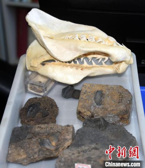 2.9億年前山西陽泉瓣齒鯊牙齒化石與現(xiàn)生大白鯊牙齒(上)比較。 中新社記者 孫自法 攝