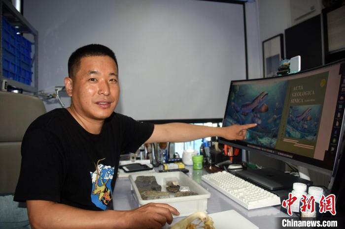 中科院古脊椎所蓋志琨副研究員在辦公室接受采訪,介紹瓣齒鯊化石新研究成果。 中新社記者 孫自法 攝