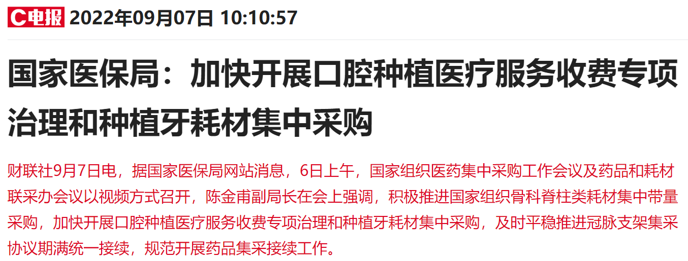 口腔種植領(lǐng)域的“天價(jià)收費(fèi)”現(xiàn)象一直被詬病。種一顆牙動(dòng)輒上萬(wàn)元,甚至有“一口種植牙、縣城一套房”的說(shuō)法。今年以來(lái),一直在推進(jìn)種植牙集采相關(guān)工作。1月10日,國(guó)務(wù)院常務(wù)會(huì)議曾明確提出,今年要對(duì)群眾關(guān)注的骨科耗材、藥物球囊、種植牙開(kāi)展集采。8月18日,醫(yī)保局出臺(tái)《關(guān)于開(kāi)展口腔種植醫(yī)療服務(wù)收費(fèi)和耗材價(jià)格專(zhuān)項(xiàng)治理的通知(征求意見(jiàn)稿)》(以下簡(jiǎn)稱(chēng)《意見(jiàn)稿》),規(guī)范口腔種植醫(yī)療服務(wù)和耗材收費(fèi)方式,強(qiáng)化價(jià)格調(diào)控,廣泛發(fā)動(dòng)種植牙耗材省際集采,加強(qiáng)價(jià)格監(jiān)管。