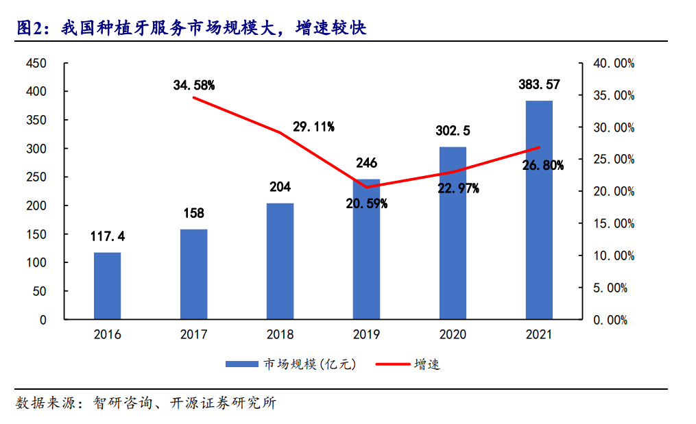 從市場(chǎng)規(guī)模來(lái)看,據(jù)智研咨詢(xún)數(shù)據(jù)顯示,2021年國(guó)內(nèi)種植牙服務(wù)市場(chǎng)規(guī)模已超380億元,市場(chǎng)需求居高不下。