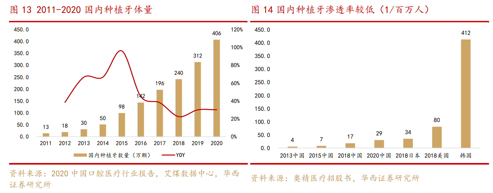 老齡化下高需求驅(qū)動(dòng)種植牙數(shù)量高速增長(zhǎng)。華西證券分析師崔文亮5月11日發(fā)布的研報(bào)指出,2020年我國(guó)種植牙數(shù)量為406萬(wàn)顆,2015年以來(lái)復(fù)合增速高達(dá)32.88%,相當(dāng)于29顆/萬(wàn)人,雖顯著優(yōu)于2015年的7顆/萬(wàn)人,但與鄰近的韓國(guó)220萬(wàn)顆(412顆/萬(wàn)人)、日本43萬(wàn)顆(34顆/萬(wàn)人)相比,我國(guó)的種植牙滲透率仍較低,潛在存量需求數(shù)量約4000萬(wàn)顆,尚有十倍發(fā)展空間,預(yù)期隨著老齡化加速及大眾對(duì)口腔問(wèn)題愈加重視以及執(zhí)業(yè)醫(yī)師供給的增加,國(guó)內(nèi)種植牙需求仍將維持高速增長(zhǎng)水平。