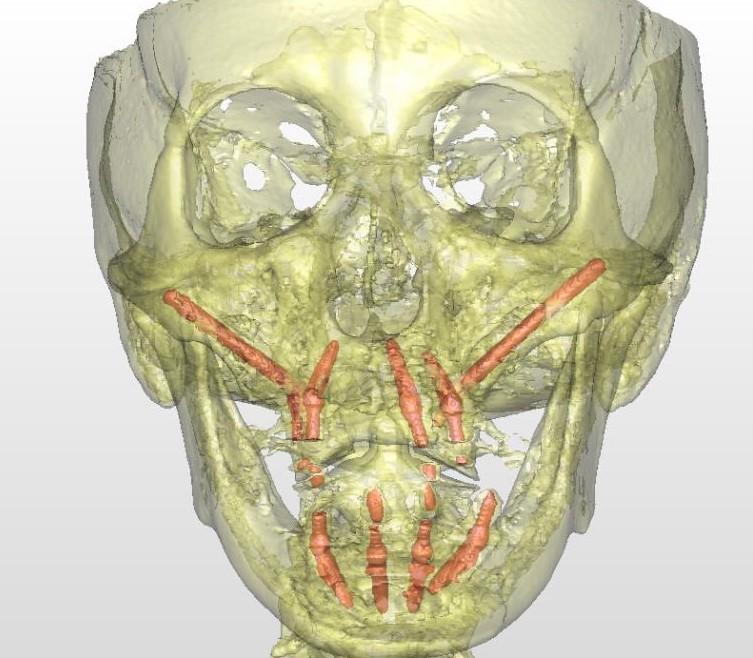 手術(shù)當(dāng)天,江宏兵院長(zhǎng)在數(shù)字化外科導(dǎo)板和數(shù)字化導(dǎo)航輔助下,于上頜后牙區(qū)成功植入2枚Nobel穿顴種植體,前牙區(qū)植入3枚NobelParallel CC種植體,并在上頜竇開窗區(qū)及過薄的種植體唇側(cè)充填骨粉,覆蓋膠原膜。下頜則在數(shù)字化外科導(dǎo)板引導(dǎo)下,避開患者數(shù)年前充填的美容假體和其他重要解剖結(jié)構(gòu),植入4枚NobelParallel CC種植體,所有種植體初期穩(wěn)定性均達(dá)到35 N?cm,符合負(fù)重的要求。