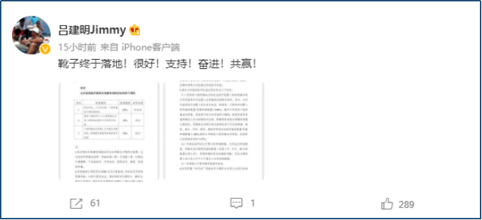 對(duì)于上述政策,通策醫(yī)療的董事長(zhǎng)呂建明更是在昨晚第一時(shí)間通過(guò)微博發(fā)出放寬條件截圖,并發(fā)表評(píng)論稱,“靴子終于落地!很好!支持!奮進(jìn)!共贏!”