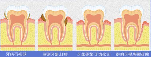 堆積的牙菌斑聚在一起,日積月累,就會(huì)形成牙結(jié)石,從而導(dǎo)致更嚴(yán)重的口腔問題。一張圖來了解下牙結(jié)石傷害牙齒的過程: