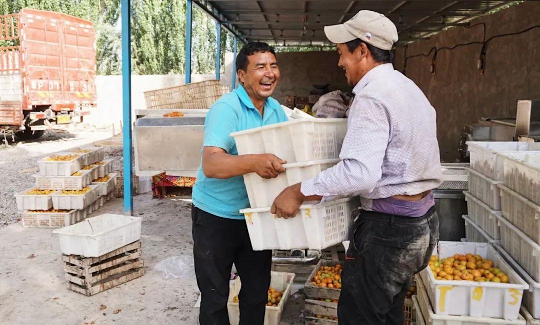 烏布力·艾孜(左)正在合作社搬運杏子