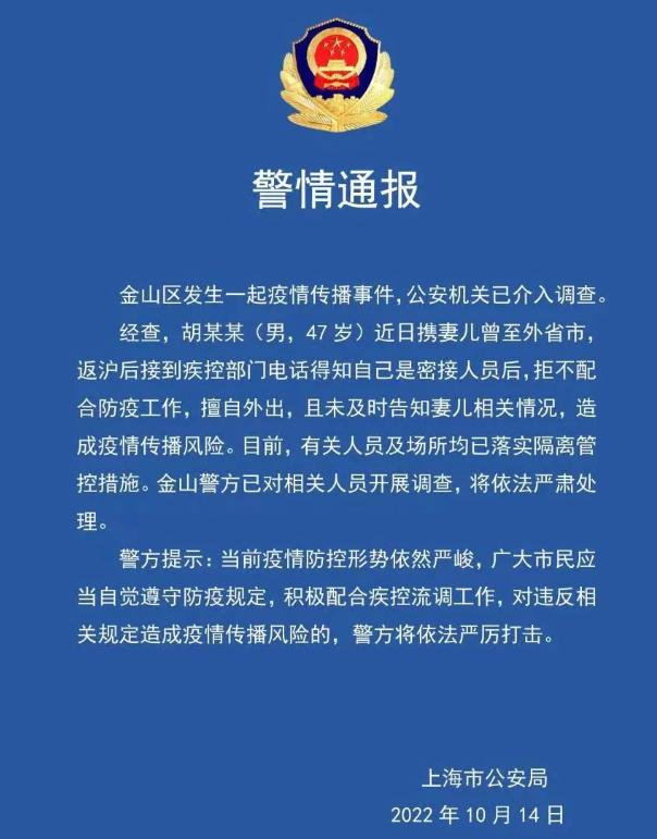 經(jīng)查,胡某某(男,47歲)近日攜妻兒曾至外省市,返滬后接到疾控部門電話得知自己是密接人員后,拒不配合防疫工作,擅自外出,且未及時(shí)告知妻兒相關(guān)情況,造成疫情傳播風(fēng)險(xiǎn)。目前,有關(guān)人員及場(chǎng)所均已落實(shí)隔離管控措施。金山警方已對(duì)相關(guān)人員開展調(diào)查,將依法嚴(yán)肅處理。