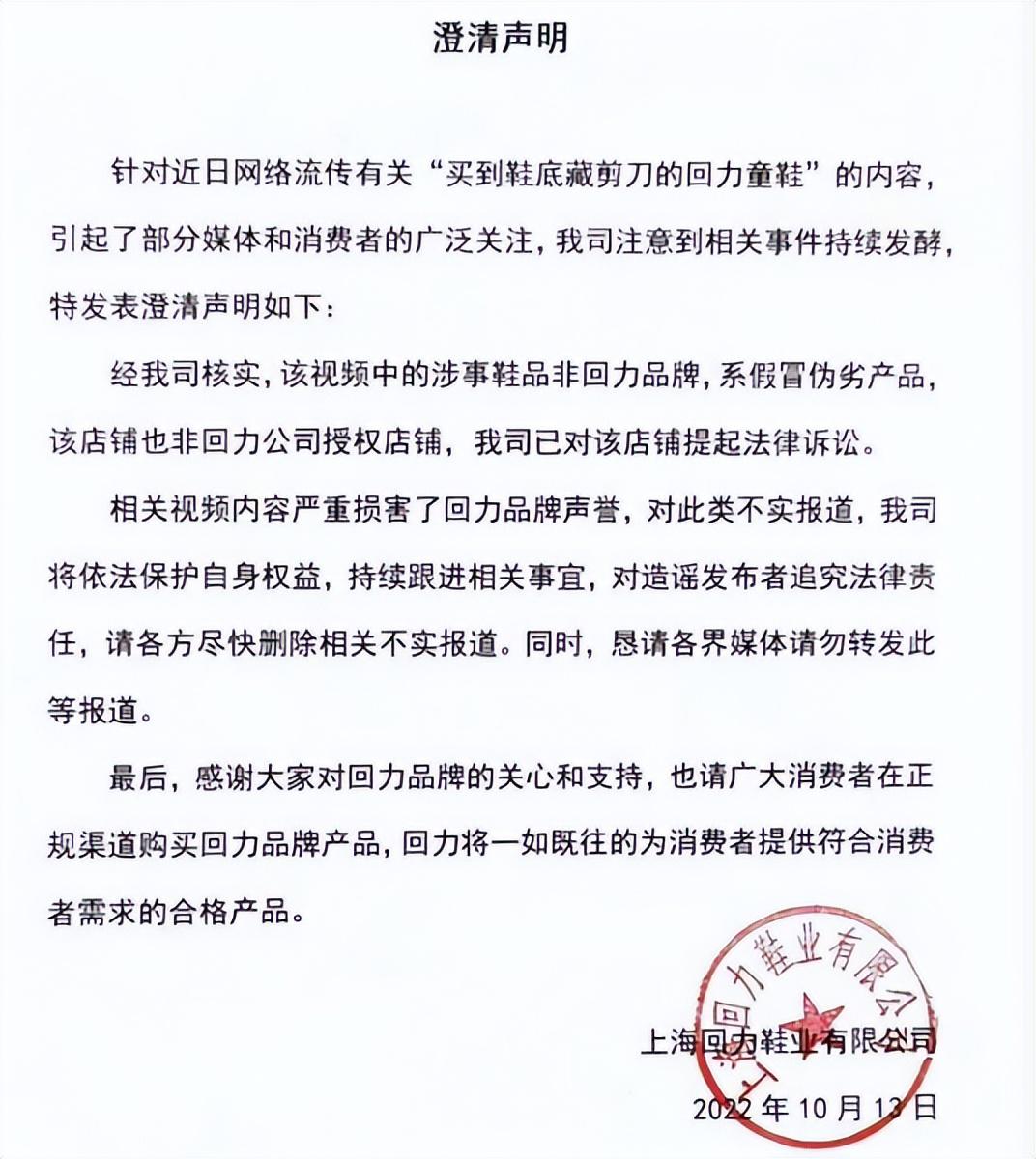 3)回力:網(wǎng)傳藏剪刀童鞋非回力品牌,系假冒偽劣產(chǎn)品。