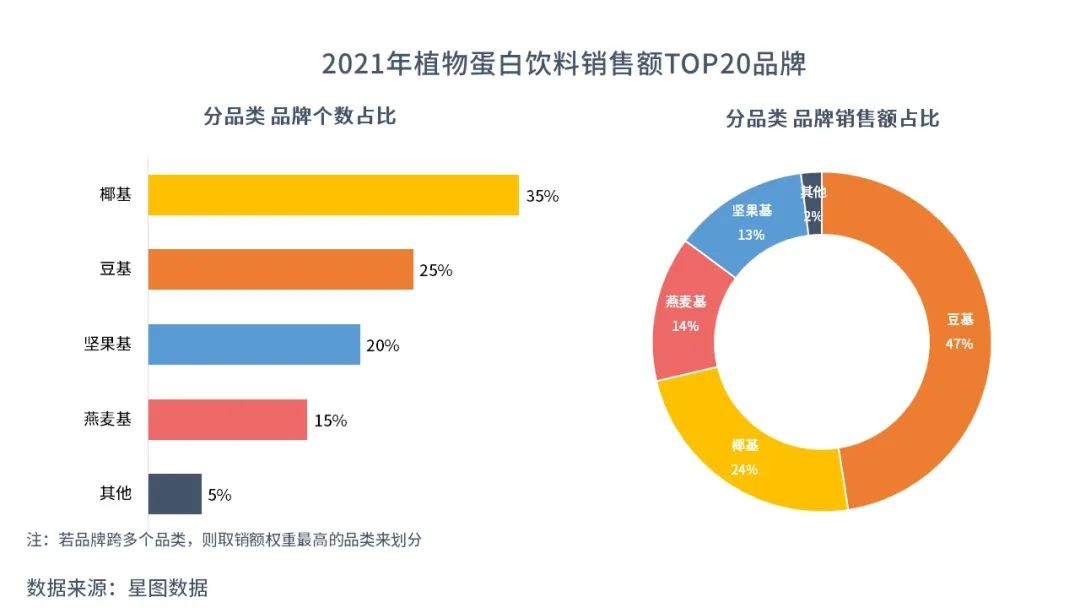 從2021年銷額排名前20的植物蛋白飲料品牌來(lái)看,椰基品牌數(shù)量占比多,為35%;而其品類銷售額也超過(guò)了之前大熱的燕麥奶。