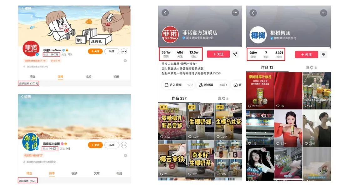 二是重視官方微信號(hào)、微博號(hào)、抖音號(hào)等社交媒體的運(yùn)營(yíng),保持一定的內(nèi)容輸出以及互動(dòng),增加用戶對(duì)品牌的興趣。截至4月13號(hào),菲諾的微博顯示,共發(fā)布2013條微博,粉絲119.7萬(wàn),其抖音作品數(shù)量237條,粉絲13.5萬(wàn);對(duì)比之下,椰樹(shù)發(fā)布的微博共計(jì)165條,粉絲10.6萬(wàn),其抖音作品13條,粉絲6491。