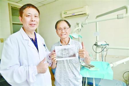 73歲的鄧狄生家住香港,年輕時(shí)飽受牙周炎困擾,40歲時(shí)下頜的牙齒全部脫落,只好到醫(yī)院佩戴活動(dòng)義齒。但活動(dòng)義齒給他的生活帶來(lái)較大不便,打噴嚏、甚至大聲說(shuō)話,義齒都會(huì)掉在地上,讓鄧狄生尷尬。他到香港的醫(yī)院看牙醫(yī),希望做種植牙,但醫(yī)生告訴他,由于牙槽骨太薄,骨牙不足,做種植牙操作難度很大。2006年,鄧狄生來(lái)到深圳友誼醫(yī)院口腔科咨詢,正巧遇上了在該院進(jìn)行技術(shù)幫扶的中南醫(yī)院口腔科陳建剛教授,陳教授為鄧狄生進(jìn)行了詳細(xì)檢查后,為他的下頜安裝了5顆種植牙。有了新的“牙齒”,鄧狄生高興極了,他告訴陳建剛教授,因?yàn)檠啦缓茫?0年來(lái)他都沒有吃米飯,只能吃面條和粥,“種牙”后終于可以正常飲食。一年后,鄧狄生到友誼醫(yī)院面謝陳建剛教授,卻被告知陳教授已返回武漢。遺憾之余,他將病歷一直妥善保存。