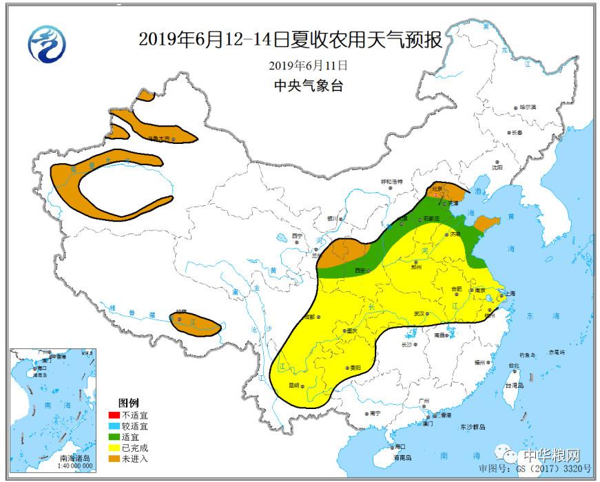 中央氣象臺預(yù)計(jì):6月12-14日,華北南部、黃淮、江淮以晴到多云天氣為主,利于加快夏收進(jìn)度。13日,華北北部將有小范圍強(qiáng)對流天氣,14日08時(shí)至15日08時(shí)西北地區(qū)東北部將有一次區(qū)域性降水天氣過程,局地麥?zhǔn)湛赡苈允苡绊憽?