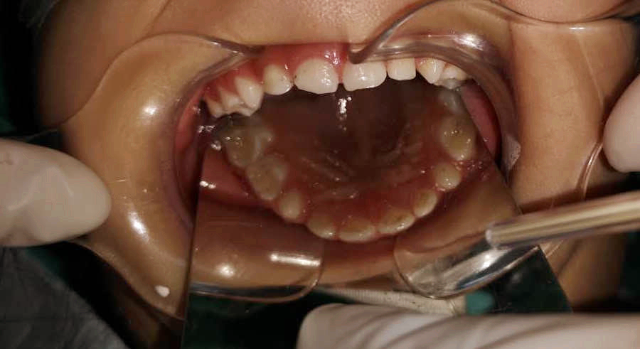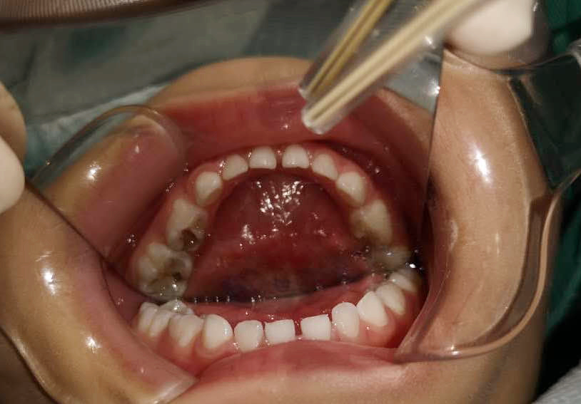 由于鑫鑫的牙齒齲壞數(shù)目多、情況嚴(yán)重,并且年齡偏小,調(diào)節(jié)難度很大,優(yōu)的調(diào)節(jié)方案是實(shí)施全麻下一次性口腔調(diào)節(jié)手術(shù)。