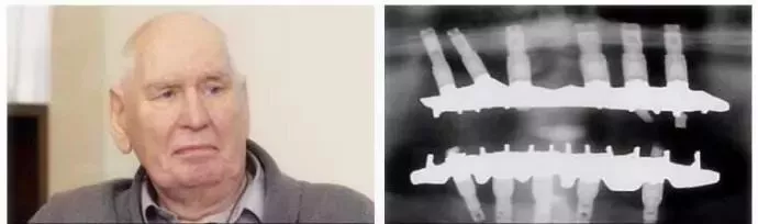 60年代,種植牙的發(fā)明者布倫馬克教授使用11個種植體來幫助斯蒂約翰遜完成上頜和下頜的重建。 斯蒂約翰遜成為世界上第二個種牙的患者。