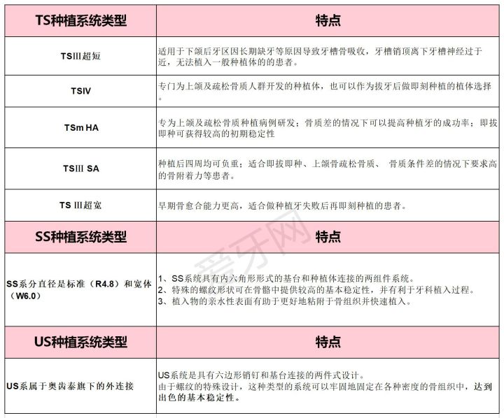 目前奧齒泰種植體旗下有三個系列,分別是常用的GS/TS系列,SS系列,US系列。這里給大家先簡單總結(jié)一下這三個系列的區(qū)別: