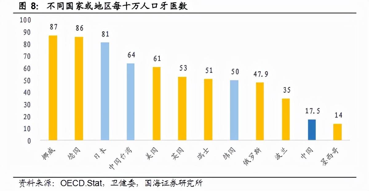 國海證券研報顯示,2019年中國每十萬人口牙醫(yī)數(shù)17.5人,遠低于韓國的50人、美國的61人、中國臺灣的64人、日本的81人。假設中國每十萬人口牙醫(yī)數(shù)將達到可比或地區(qū)的水平,則現(xiàn)階段我國牙醫(yī)缺口數(shù)約為45-90萬人。