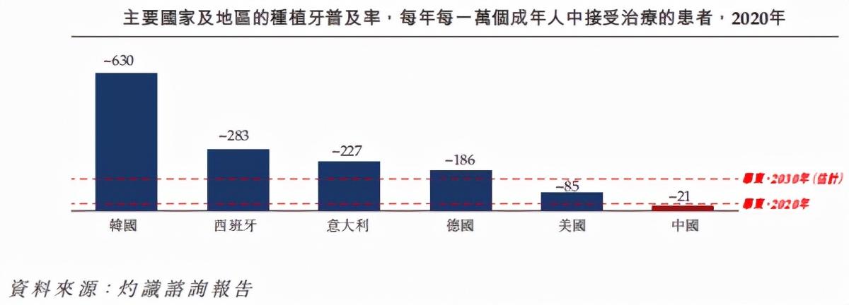 灼識咨詢報告顯示,以種植牙為例,我國2020年每一萬個成年人中,約有21人會在牙體種植方面接受調(diào)節(jié),而美國大約為85人,韓國約為630人。這表明了中國口腔服務市場的普及率相當?shù)颓抑袊谇环帐袌龃嬖诰薮鬂摿桶l(fā)展空間。