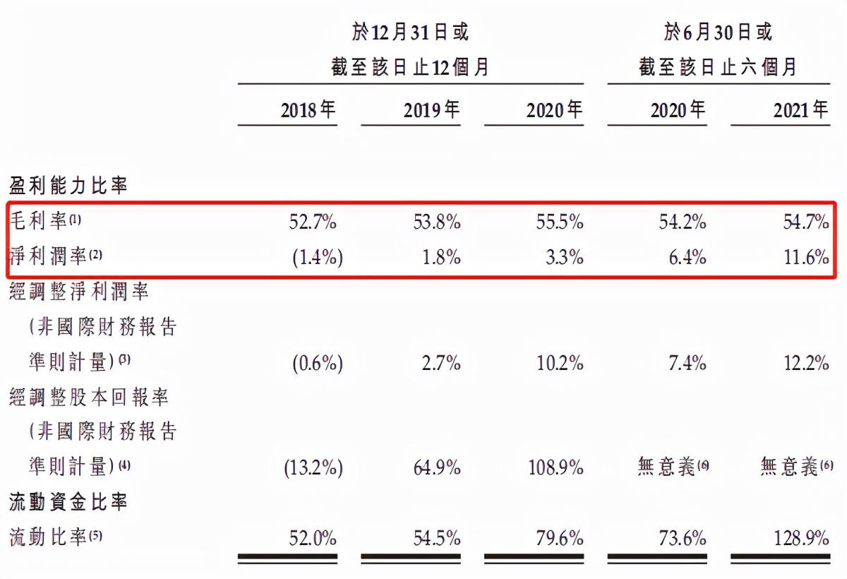2018-2020年和2021年上半年,該公司經(jīng)調(diào)整后的凈利潤分別為-390萬元、2360萬元、8530萬元和6160萬元,同期凈利率僅為-1.4%、1.8%、3.3%及11.6%。