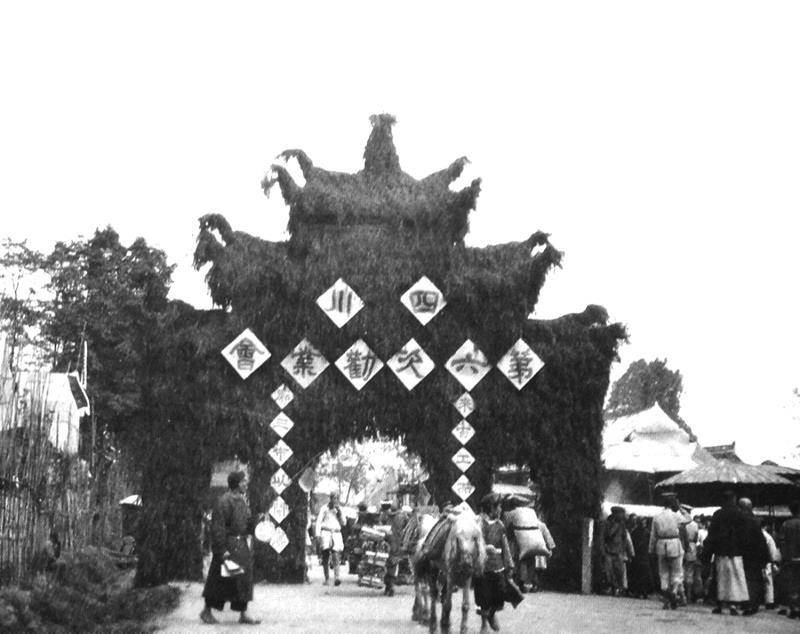 翻開鄭光路所著的《成都舊事》一書,在“成都廟會的歷史風(fēng)云”這一章節(jié),能夠看到不少百余年前關(guān)于青羊?qū)m花會的老照片。在這些被光影手段所保留下來的黑白照片中,青羊?qū)m花會盛景浮現(xiàn)在眼前:用長條凳搭起的臨時小攤上,擺放著全四川各種商品,鋪面一家接一家,令人眼花繚亂;用竹、木材料搭成的授獎臺上,當(dāng)時清政府的官員站立其上,正在為他人頒發(fā)獎狀、獎品;會場門口的“勸業(yè)會”三個大字,陽光下分外耀眼……