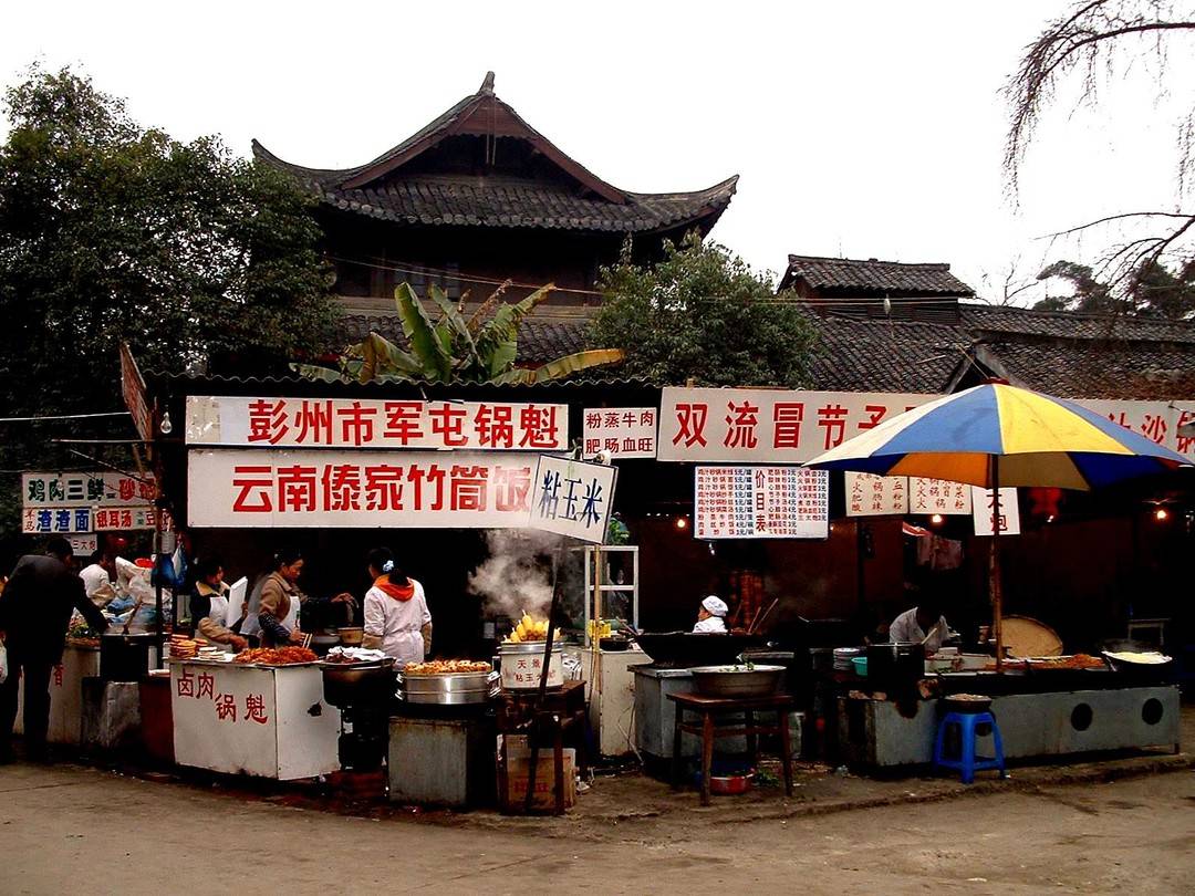 1989年“花會” 青羊?qū)m大殿墻外的小吃攤場景 攝影:鄭光路