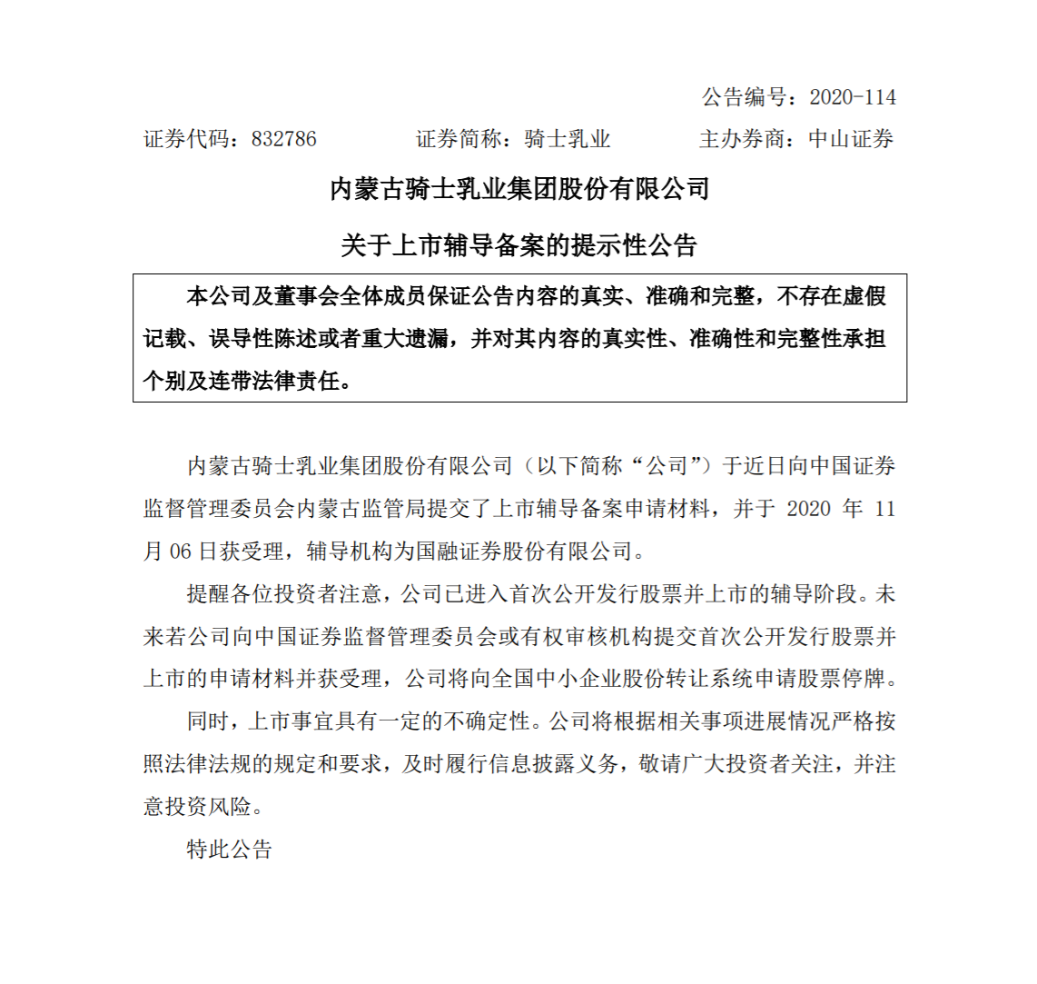 近期,新三板掛牌乳企內蒙古騎士乳業(yè)集團股份有限公司(簡稱“騎士乳業(yè)”)向內蒙古監(jiān)管局提交上市輔導備案申請材料并獲受理。在生鮮乳供應緊張、奶價不斷上漲、乳業(yè)上游投資并購活躍的背景下,業(yè)內認為,騎士乳業(yè)選擇此時上市將迎來市場與政策環(huán)境的利好。