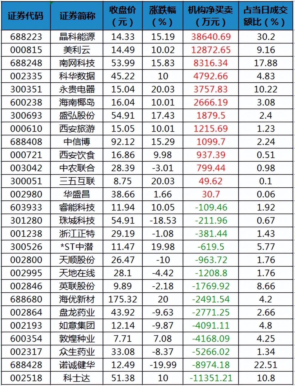 盤后龍虎榜數(shù)據(jù)顯示,周一機(jī)構(gòu)席位資金合計(jì)凈買入約3.27億元。其中,凈買入的個(gè)股13只,凈賣出的個(gè)股14只。機(jī)構(gòu)凈買入多的股票是晶科能源,凈買入金額約3.86億元;機(jī)構(gòu)凈買入居前的還有美利云、南網(wǎng)科技、科華數(shù)據(jù)等股。機(jī)構(gòu)凈賣出多的股票是科士達(dá),凈賣出金額約1.14億元;機(jī)構(gòu)凈賣出居前的還有諾誠(chéng)健華、眾生藥業(yè)、敦煌種業(yè)等股。