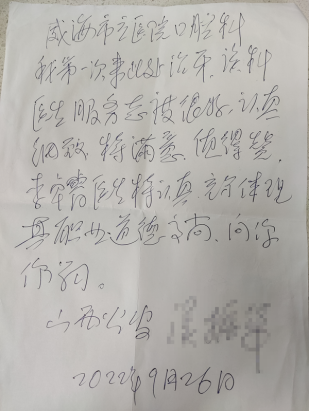 侯先生對(duì)比起當(dāng)年在外地看牙的經(jīng)歷,不禁感嘆:“這么短的時(shí)間就解決了我這么多的口腔問題,威海市立醫(yī)院口腔科服務(wù)如此便捷高,以后看牙再也不用東奔西跑了”。