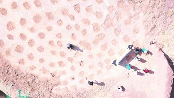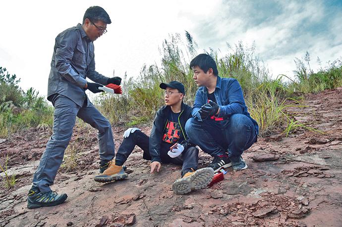考察隊員在研究恐龍足跡