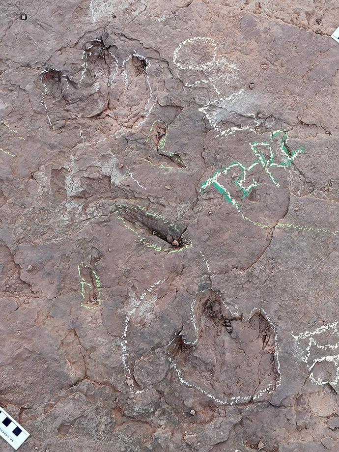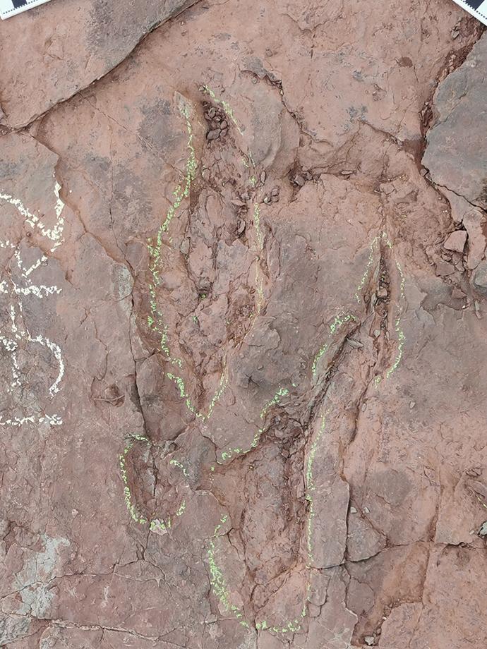 據(jù)介紹,目前,考察隊已在泥質(zhì)粉砂巖或粉砂質(zhì)泥巖層面上清理出恐龍足跡240余枚,包括植食性蜥腳類,大、中、小型鳥腳類,肉食性大型三趾型獸腳類,兩趾型恐爪龍類,小型獸腳類等至少八種造跡者(恐龍)。
