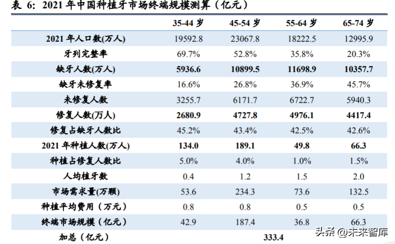 2021 年中國(guó)種植牙終端市場(chǎng)規(guī)?;蜻_(dá)到 333 億左右,占口腔醫(yī)療服務(wù)市場(chǎng) 規(guī)模 16.2%。第四次全國(guó)口腔健康調(diào)查時(shí)間窗口為 2015-2017 年,過往數(shù) 年中國(guó)口腔健康水平有所提升,故參考調(diào)查報(bào)告相關(guān)參數(shù)做出調(diào)整,并提 出如下核心假設(shè):1)牙列完整率增加 2%;2)缺牙未修復(fù)率下降 2%;3) 考慮到不同年齡骨基質(zhì)水平、經(jīng)濟(jì)水平差異,假設(shè)四個(gè)年齡段人均植牙數(shù) 0.4/1.2/1.5/2 ; 4 ) 各 年 齡 段 種 植 人 群 占 修 復(fù) 人 群 的 比 例 分 別 為 5%/4%/1%/1.5%;5)35-54 歲人群平均植牙費(fèi)用按 8000 元計(jì),55-74 歲人 群平均植牙費(fèi)用按 5000 元計(jì)?;谝陨霞僭O(shè),我們測(cè)算 2021 年中國(guó)種植 牙市場(chǎng)終端規(guī)模約為 333.4 億元,四個(gè)年齡段對(duì)應(yīng)滲透率分別是 0.7%/0.5%/0.1%/0.1%。我們認(rèn)為,鑒于經(jīng)濟(jì)水平、居民健康意識(shí)快速提 升,集采政策落地后中國(guó)種植牙市場(chǎng)滲透率有望實(shí)際較大提升。