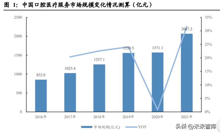 1. 口腔醫(yī)療服務(wù)行業(yè)供、需兩旺,市場(chǎng)空間廣闊中國(guó)口腔醫(yī)療服務(wù)行業(yè)正處于快速發(fā)展階段,2021 年市場(chǎng)規(guī)模預(yù)計(jì)突破 2000 億元,根據(jù)我們測(cè)算,2021 年行業(yè)整體同比增長(zhǎng) 31.6%,較 2019 年 復(fù)合增速達(dá)到 15.1%。供給端和需求端受疫情影響雖有短期波動(dòng),但長(zhǎng)期 看二者仍然呈現(xiàn)持續(xù)高速增長(zhǎng)趨勢(shì)。我們認(rèn)為,口腔醫(yī)療服務(wù)市場(chǎng)仍有較 大成長(zhǎng)空間,集采背景下,1)“供需兩旺”仍有望繼續(xù)維持;2)量?jī)r(jià)齊升 邏輯仍然有望保持,在結(jié)構(gòu)上,數(shù)量增速將快于價(jià)格增速。